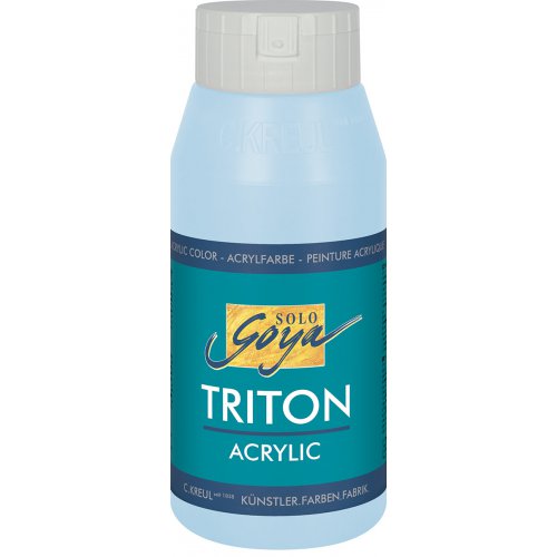 Akrylová barva TRITON SOLO GOYA 750 ml Je všestranná, velmi kvalitní akrylová barva ve studijní kvalitě. Je lehce roztíratelná, ideální pro umělecké akademie a školy. Tyto akrylové barvy perfektně doplňují akrylové fixy TRITON Kreul, které mají úplně stejné odstíny a jsou tedy výborné na malování kontur, které následně můžete vybarvit akrylovou barvou TRITON Solo Goya. Tento akrylový systém pak doplňují ještě akrylové inkousty TRITON Kreul, kterými můžete buď rovnou malovat nebo se jimi dají doplnit vybrané odstíny akrylových fixů TRITON Kreul. nebesky modrá – krycí a velmi světlostálá Akrylová barva TRITON Solo Goya je: vhodná na plátno, papír, dřevo, stěny, karton, kámen, kov, kůži a plasty. na vodní bázi vhodná i na velké plochy brilantní, dobře krycí vodou ředitelná barvy lze mezi sebou libovolně míchat a vytvářet tak další barevné odstíny rychleschnoucí, po zaschnutí matná vhodná pro vnitřní i venkovní použití po zaschnutí voděodolná fluorescenční barvy září pod černým světlem baleno v univerzální plastové láhvi vyrobeno v Německu