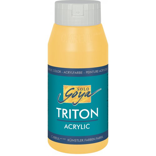 Akrylová barva TRITON SOLO GOYA 750 ml Je všestranná, velmi kvalitní akrylová barva ve studijní kvalitě. Je lehce roztíratelná, ideální pro umělecké akademie a školy. Tyto akrylové barvy perfektně doplňují akrylové fixy TRITON Kreul, které mají úplně stejné odstíny a jsou tedy výborné na malování kontur, které následně můžete vybarvit akrylovou barvou TRITON Solo Goya. Tento akrylový systém pak doplňují ještě akrylové inkousty TRITON Kreul, kterými můžete buď rovnou malovat nebo se jimi dají doplnit vybrané odstíny akrylových fixů TRITON Kreul. kadmium žlutá – polotransparentní a středně světlostálá Akrylová barva TRITON Solo Goya je: vhodná na plátno, papír, dřevo, stěny, karton, kámen, kov, kůži a plasty. na vodní bázi vhodná i na velké plochy brilantní, dobře krycí vodou ředitelná barvy lze mezi sebou libovolně míchat a vytvářet tak další barevné odstíny rychleschnoucí, po zaschnutí matná vhodná pro vnitřní i venkovní použití po zaschnutí voděodolná fluorescenční barvy září pod černým světlem baleno v univerzální plastové láhvi vyrobeno v Německu