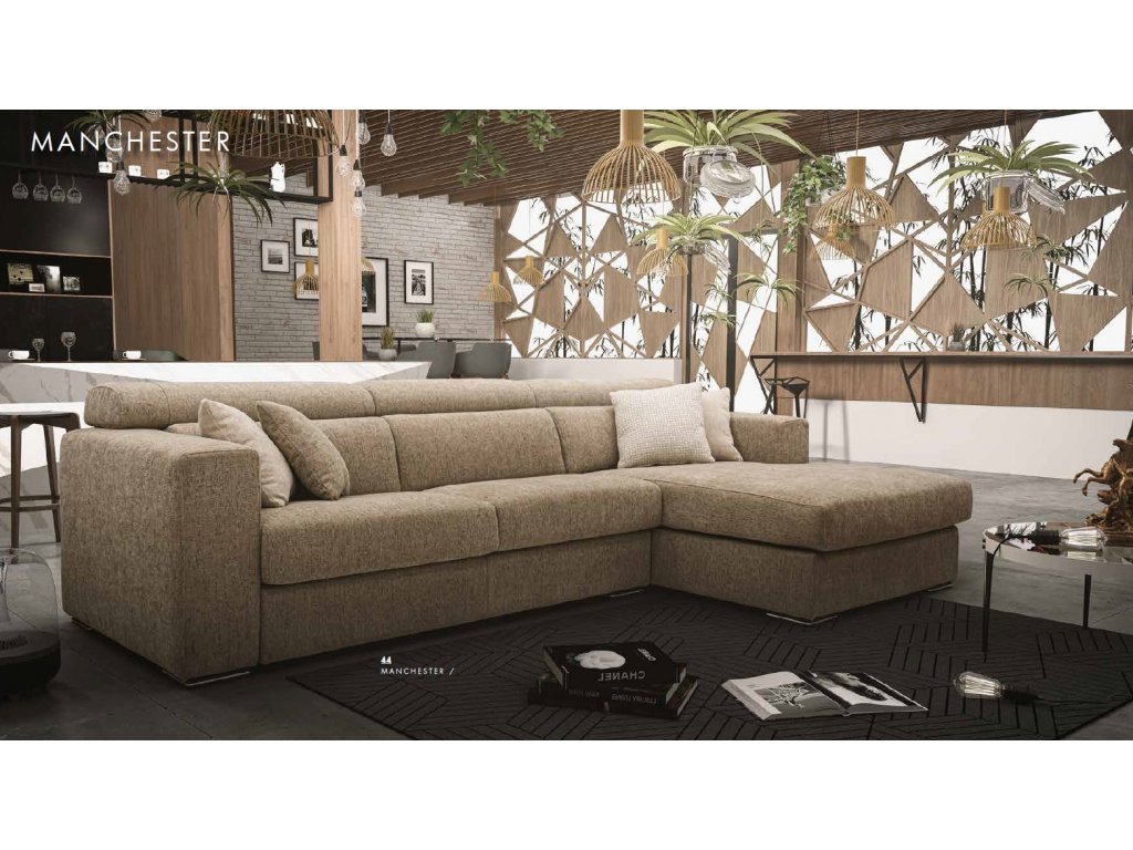 Italská sedací souprava Manchester jde s trendem. Robustní design v mnoha barevných provedeních potahů i nožek, plus polohovatelné opěrky hlavy. Lze vyrobit jak sedací soupravu zahrnující pohovku a chaiselongue, tak pouze pohovku o různých rozměrech.
