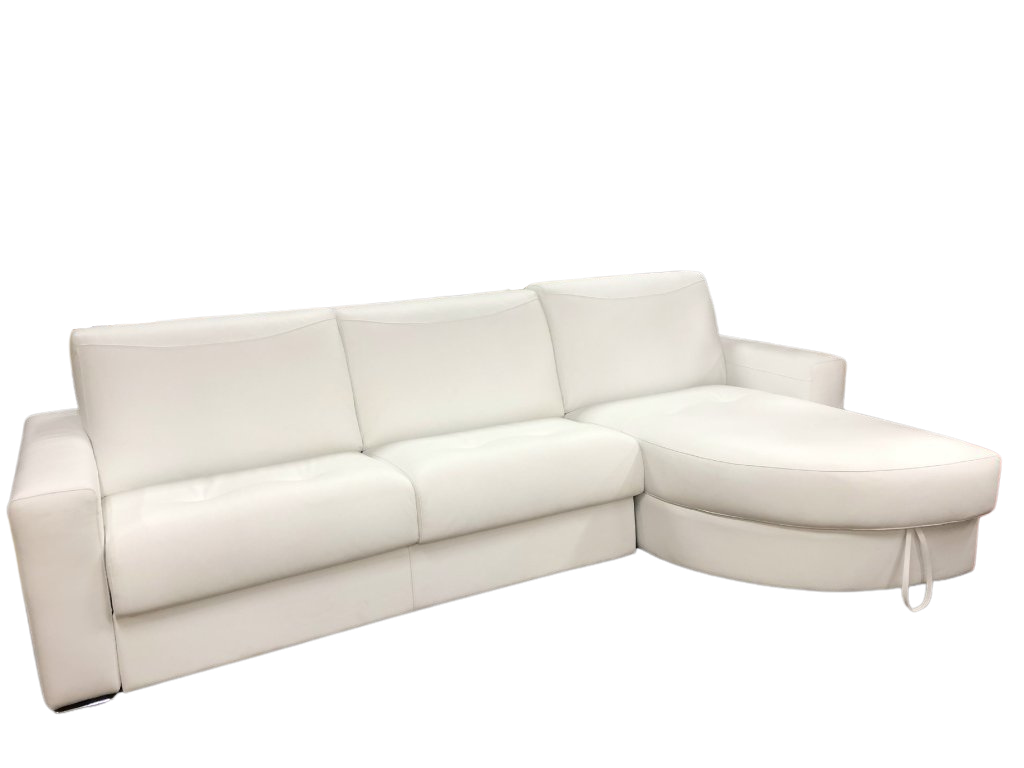 Bílá kožená (kůže Kalifornia) sedací souprava Revers italské výroby s lenoškou, úložným prostorem a rozkládacím mechanismem určeným i na každodenní spaní. V sedací soupravě je ukrytá celá matrace. Konstrukce sedací soupravy je kovová, čímž je dosáhnuto opravdové pevnosti.