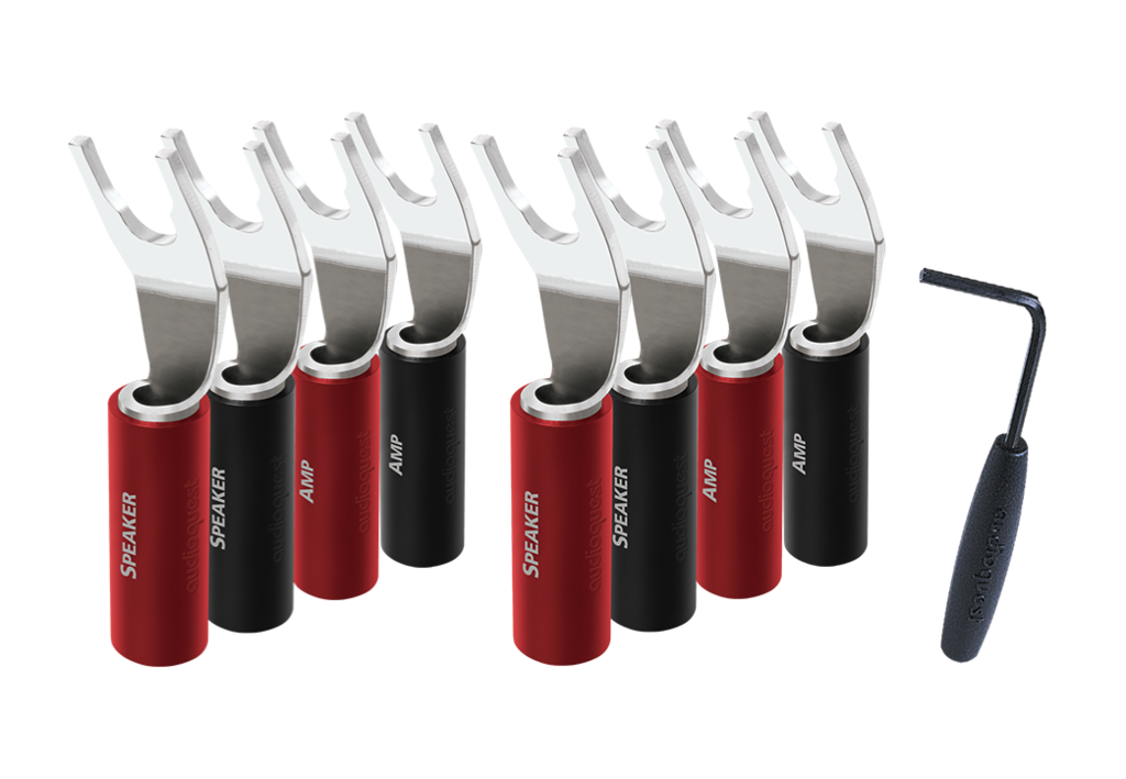 Konektory SureGrip 100 používají zlacené nebo stříbřené pokovování na vysoce kvalitní základní kov z purpurové mědi  U SureGrip 100 nejsou používány žádné podkladové mosazné vrstvy, které by nevyhnutelně způsobovaly zkreslení nebo jinak poškodily zvuk.  SureGrip 100 využívá náš efektivní systém pájení za studena. Stačí dodávaným imbusovým klíčem utáhnout šroubky na spojení a na konektor navléknout pouzdro z ABS plastu odolného vůči magnetickému rušení. Vše je rychlé a efektivní. V ceně 8 barevně rozlišených konektorů (4 x červený a 4 x černý konektor).  S ohledem na směrovost kabelů jsou také konektory označeny popisem (Speaker + Amp).  ODKAZY AudioQuest stránka produktu (EN)