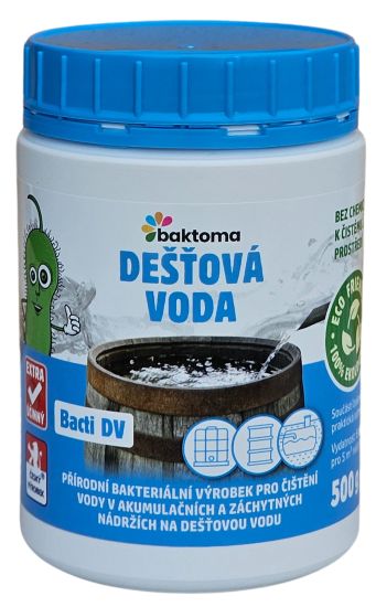 Při zachytávání dešťové vody ze střech do akumulačních nádrží se do nádrží kromě vody dostává I organický splach ze střech, který se následně začne rozkládat a nepříjemně zapáchá. Výrobek Bacti DV obsahuje pouze volně se v přírodě vyskytující bakterie a enzymy, které nastartují biodegradační proces, organický materiál velmi rychle rozloží a úplně eliminují vznikající zápach. Voda ošetřená přípravkem Bacti DV je velmi vhodná pro zalévání rostlin (zelenina, ovocné stromy, keře, atd..).