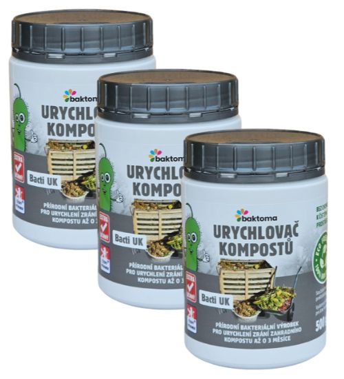 Zcela přírodní a ekologický bio-aktivní výrobek Bacti UK urychlovač kompostu je určený k urychlení kompostování. Obvyklá délka kompostování je v rozsahu jednoho roku. Výrobek Bacit UK umí značně urychlit proces zkompostování zahradního odpadu a vybraného biologického odpadu z Vaší domácnosti. Bacti UK je směs bakteriálních kultur smíchaných s nezpracovanými enzymy, emulgátory a živinami, speciálně navržená pro zkompostování organických odpadů (odpad po prořezávce – štěpka, kůra, piliny, tráva, listí, ovoce, zelenina, květiny, bioodpad z domácností apod.). Výrobek funguje ve dvou fázích: urychlení nastartování a výrazné zkrácení celého procesu kompostování. Při použití Bacti UK dochází k maximalizaci hnojících hodnot kompostu. Výsledek urychlení kompostování s Bacti UK je po cca 60ti dnech od první aplikace přípravku.