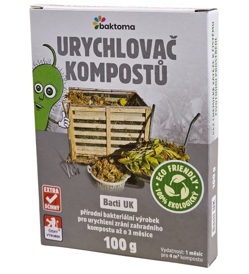Zcela přírodní a ekologický bio-aktivní výrobek Bacti UK urychlovač kompostu je určený k urychlení kompostování. Obvyklá délka kompostování je v rozsahu jednoho roku. Výrobek Bacit UK umí značně urychlit proces zkompostování zahradního odpadu a vybraného biologického odpadu z Vaší domácnosti. Bacti UK je směs bakteriálních kultur smíchaných s nezpracovanými enzymy, emulgátory a živinami, speciálně navržená pro zkompostování organických odpadů (odpad po prořezávce – štěpka, kůra, piliny, tráva, listí, ovoce, zelenina, květiny, bioodpad z domácností apod.). Výrobek funguje ve dvou fázích: urychlení nastartování a výrazné zkrácení celého procesu kompostování. Při použití Bacti UK dochází k maximalizaci hnojících hodnot kompostu. Výsledek urychlení kompostování s Bacti UK je po cca 60ti dnech od první aplikace přípravku.