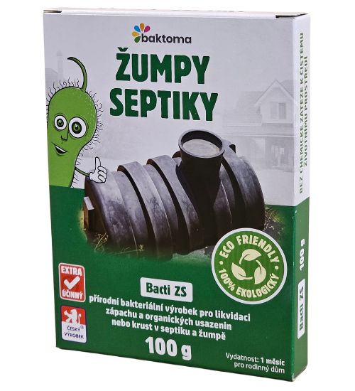 Bacti ZS je prostředek určený pro rozklad organických nečistot, usazenin a kalů v žumpách a septicích. Působením bakterií a jimi tvořených enzymů dochází ke zkapalnění pevného organického odpadu, který se změní v nezapáchající kapalinu. Kapalinu lze posléze bez problémů čerpat, nedochází k ucpávání kanalizace ani případných trativodů.  Pravidelným používáním tak odpadá časté a nákladné vyvážení a čištění septiku nebo žumpy, neboť dříve se tvořící krusty a usazeniny snižovaly využitelný obsah žumpy nebo septiku a vývoz tudíž musel být mnohem častější. Veškerý organický odpad se rozkládá zejména na vodu a CO2.