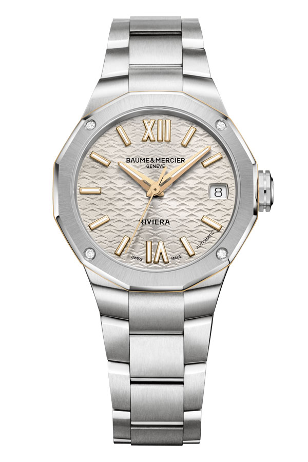 Dámské hodinky od světoznámé značky Baume & Mercier z kolekce Riviera ocení všechny ženy, které preferují jemnou eleganci a sportovní styl. Velmi rychle se stanou nepostradatelným doplňkem pro každou příležitost – formální, slavnostní i volnočasovou. Luxusní vzhled kulatého pouzdra s béžovým analogovým ciferníkem podtrhuje luneta osazená čtyřmi diamanty. Pouzdro i pásek s klasickou překlápěcí sponou jsou vyrobeny z ušlechtilé oceli ve stříbrné barvě. Špičkový mechanický strojek na automatický nátah je doplněn funkcí datumovky pro rychlou orientaci nejen v čase, ale i dnech.