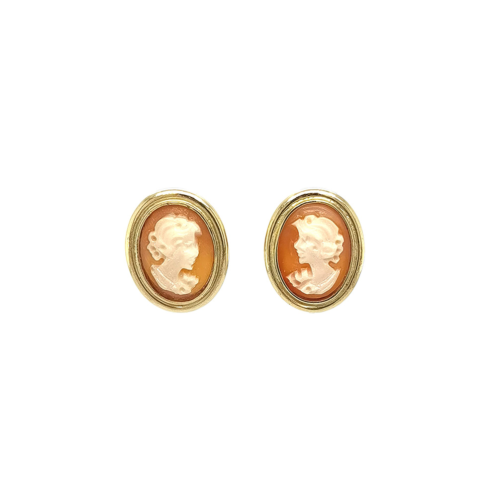 Tyto nádherné oválné kamejové náušnice vyzařují nadčasovou eleganci a jemný vintage styl. Každá náušnice je zdobena precizně vyřezávaným reliéfem ženského profilu, zasazeným do teplého tónu přírodní mušle a obklopeným decentním zlatým rámem. Jemné a sofistikované zpracování dělá z těchto náušnic ideální doplněk pro každou příležitost, ať už pro každodenní nošení, nebo jako výjimečný šperk pro slavnostní události.