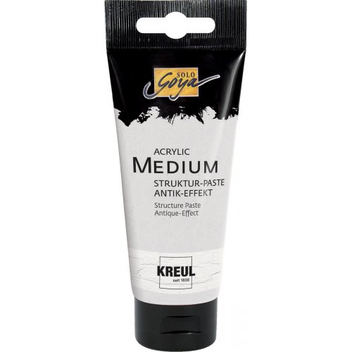 Strukturovací pasta SOLO GOYA 100 ml antický efekt Při setkání akrylových barev, strukturovacích past a gelů vzniká na plátně nejen optický, ale i hmatový svět zážitků. Strukturovací pasty jsou vhodné pro plastické, pastovité ztvárnění povrchu se strukturami, lze je použít jako základní nátěr, k dosažení různých textur pozadí, jsou vhodné pro různé trojrozměrné efekty a jako lepidlo pro koláže. Všechny strukturovací pasty a gely jsou na vodní bázi jsou ideální pro návrhy pomocí malířského paletového nože a pro aplikace bohaté na textury pomocí štětce. Akrylová strukturovací pasta antický efekt je vhodná pro povrchové úpravy se starobylým efektem. má konzistenci roztíratelné pasty zasychá bíle, matně a neprůhledně dobřě kryje ideální pro malování na papír, karton, plátno, lepenku, kámen, kov, dřevo, kůži a mnoho umělých povrchů.