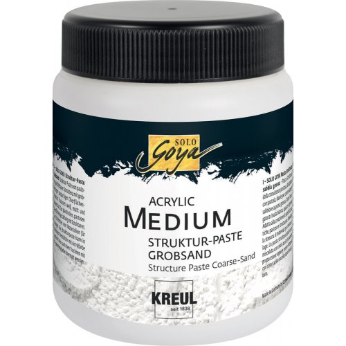 Strukturovací pasta SOLO GOYA 250 ml hrubý písek Při setkání akrylových barev, strukturovacích past a gelů vzniká na plátně nejen optický, ale i hmatový svět zážitků. Strukturovací pasty jsou vhodné pro plastické, pastovité ztvárnění povrchu se strukturami, lze je použít jako základní nátěr, k dosažení různých textur pozadí, jsou vhodné pro různé trojrozměrné efekty a jako lepidlo pro koláže. Všechny strukturovací pasty a gely jsou na vodní bázi jsou ideální pro návrhy pomocí malířského paletového nože a pro aplikace bohaté na textury pomocí štětce. Akrylová strukturovací pasta hrubý písek má konzistenci roztíratelné pasty s hrubozrnnou pískovou povrchovou strukturou zasychá bíle, matně a neprůhledně lze smíchat s akrylovou barvou v libovolném poměru nebo ji po zaschnutí přetřít olejovou či akrylovou barvou ideální pro malování na papír, karton, plátno, lepenku, kámen, kov, dřevo, kůži a mnoho umělých povrchů