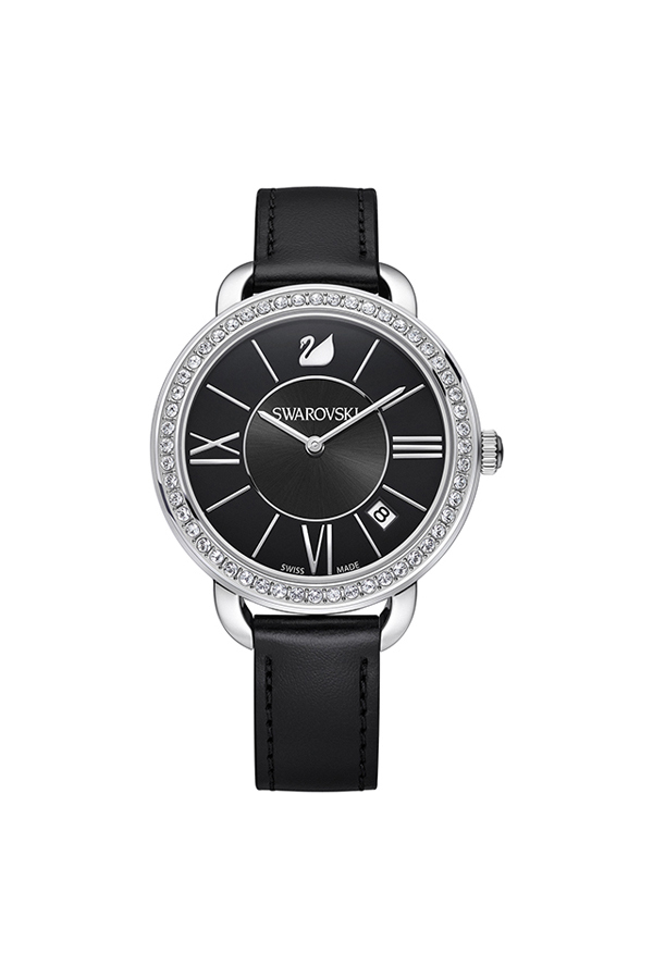 Třpytivé dámské hodinky s lunetou zdobené krystaly Swarowski. Číselník černé barvy doplňují jemné stříbrné detaily a elegantní labuť, charakteristická pro tuto značku. Decentní kožený pásek skvěle obepne každé dámské zápěstí. Jemné ženské hodinky, které si oblíbíte pro denní i večerní nošení.
