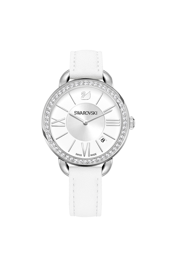 Jemné dámské hodinky s krystaly Swarowski, s nimiž ve společnosti zaujmete. Model laděný do bílé a stříbrné barvy doplňuje bílý kožený pásek. Analogový číselník, chráněný minerálním sklem, v sobě spojuje elegantní římské číslice a datumovku. Dostupný luxus, který potěší vás i vaši peněženku.