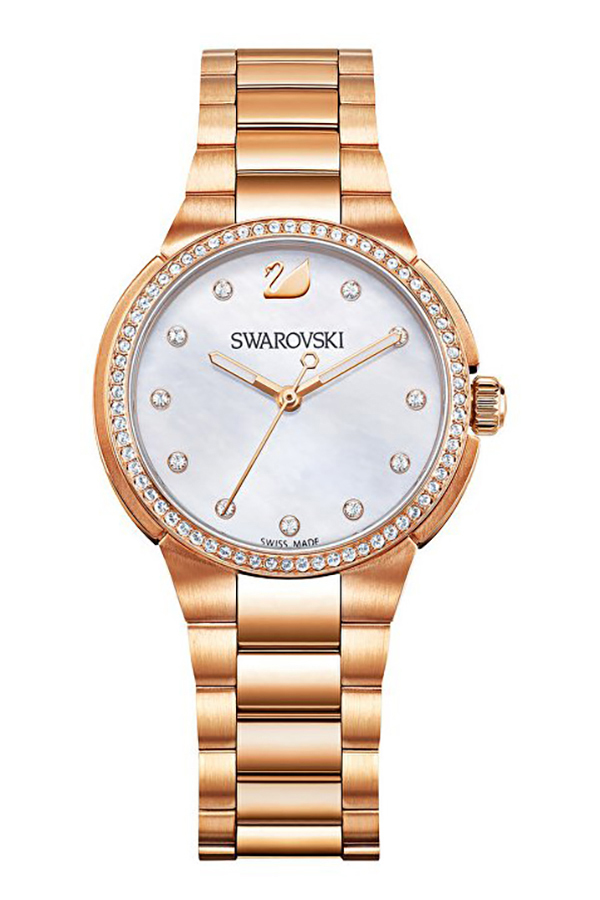 Elegantní model dámských hodinek z kolekce City s růžovým zlacením pouzdra i řemínku je zdoben krystaly Swarovski po obvodu lunety i na perletí vykládaném číselníku. Ten mimo jiné nese na pozici dvanácté hodiny i symbol značky: růžově zlacenou labuť.