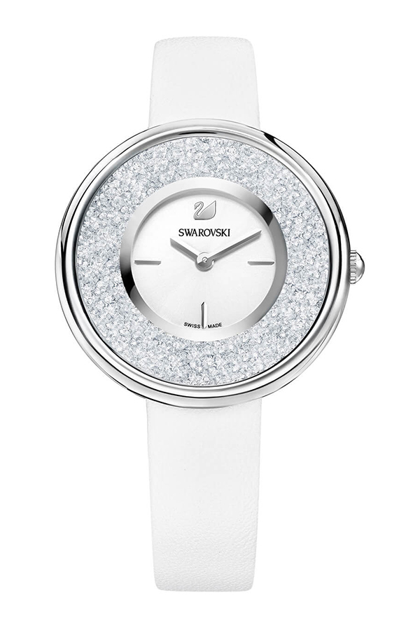 Módní dámské hodinky z řady Crystalline Pure jsou oslavou čistého designu a jemné ženskosti. Pouzdro z ušlechtilé nerez oceli skrývá dva soustředné kruhy, z nichž ten vnější nabízí pohled na 850 krystalů Swarovski. Na menším je zobrazen jednoduchý bílý číselník. Hodinky se zapínají pomocí koženého řemínku.