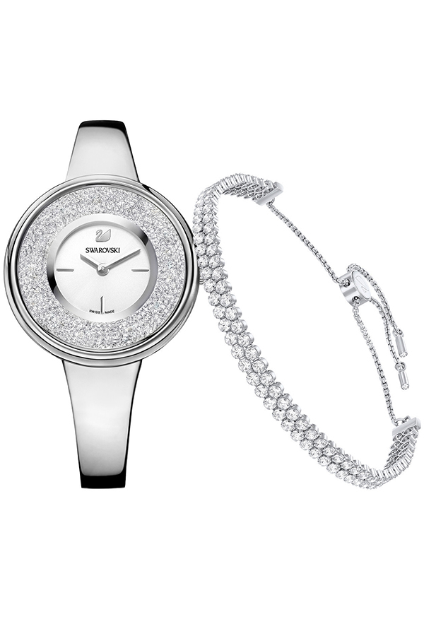 Sada dámských hodinek z kolekce Crystalline Pure a náramku představuje ideální dárek pro každou ženu. Hodinky jsou vsazené do pevného náramku z nerez oceli a jejich číselník obklopuje 850 krystalů Swarovski v bílé barvě. Stejné, pouze o něco větší kamínky jsou i na druhé části setu: něžném náramku.