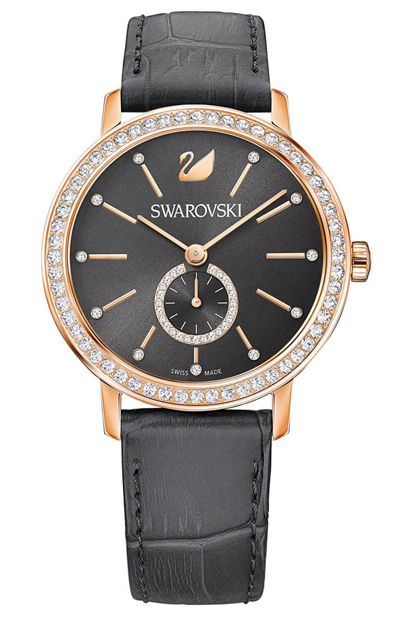Zůstaňte elegantní a šik za všech okolností: s dámskými hodinkami z kolekce Graceful Lady je to hračka. V růžově zlaceném pouzdru spočívá antracitově šedý číselník, dokola lemovaný 56 průzračnými krystaly Swarovski. Řemínek hodinek je vyroben z černé kůže s jemným prošitím.