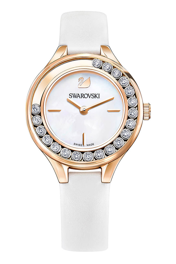 Čistotu designu a jemné tvarové linie dámských hodinek z kolekce Lovely Crystals ještě umocňuje zářivě bílá barva číselníku a jemného řemínku z pravé kůže. Hodinky mají ocelové růžově zlacené pouzdro, kolem kterého je umístěno 20 volně pohyblivých čirých krystalů Swarovski.
