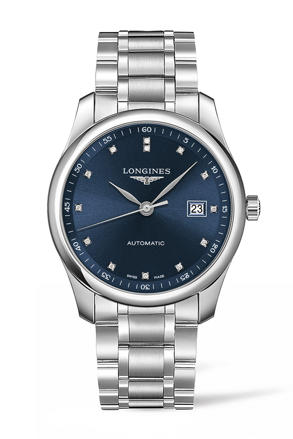 THE LONGINES MASTER COLLECTION představuje vytříbené modely, které zaujmou mimořádně pečlivým zpracováním i atraktivními materiály. V modelu s páskem z oceli dominuje modrá plocha ciferníku. Souhra modré a stříbrné působí mimořádně elegantně a nadčasově. Luxusní vzhled přidává i zdobení drobnými diamanty v obvodu. Diamanty oddělují hodinové úseky, minutové jsou tvořeny stylisticky opět stříbrně. Doplněna je datumovka. Hodinky řídí mechanika s automatickým nátahem.