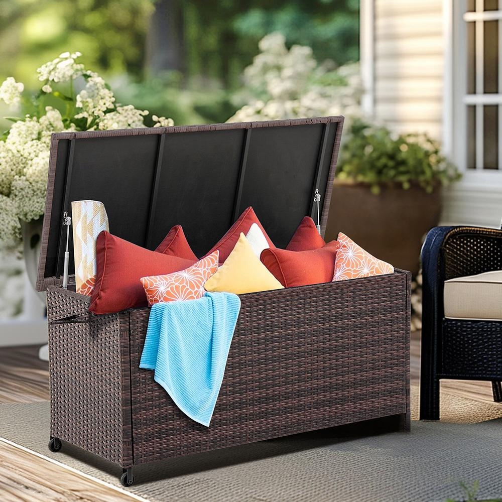 Stabilní ocelová konstrukce v kombinaci s kvalitním PE ratanem dává celé skříni pevnost, styl i odolnost vůči počasí. Vnitřní vložka z voděodolného polyesteru ochrání obsah i při dešti a víko drží otevřené praktické písty, takže nehrozí žádné přiskřípnuté prsty.