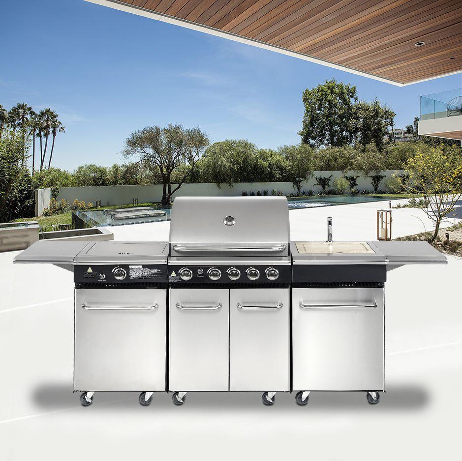 Kvalitní zpracování z nerezové oceli, vysoký výkon jednotlivých hořáků kvalifikuje gril i pro použití profesionálů. Velký prostor pro grilování, vaření, přípravu potravin. Vestavěný nerez dřez s chromovanou baterií krytý dřevěným řeznickým prkénkem. Mohutné sendvičové nerezové víko grilu s robustním madlem a vestavěným teploměrem. Nerezové sendvičové dveře a prostorné kabinety umožňující uložení nádobí a příslušenství, dokonce např. s možností umístění malé chladničky na nápoje, nebo potraviny nebo například výrobník ledu apod.