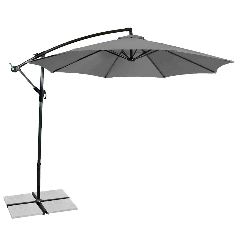 Ačkoli je součástí balení křížový stojan, pro maximální stabilitu je doporučeno jeho doplnění o betonové dlaždice, které nejsou zahrnuty v balení. Tento detail zajišťuje, že slunečník bude pevně stát na svém místě i během větrných dnů.