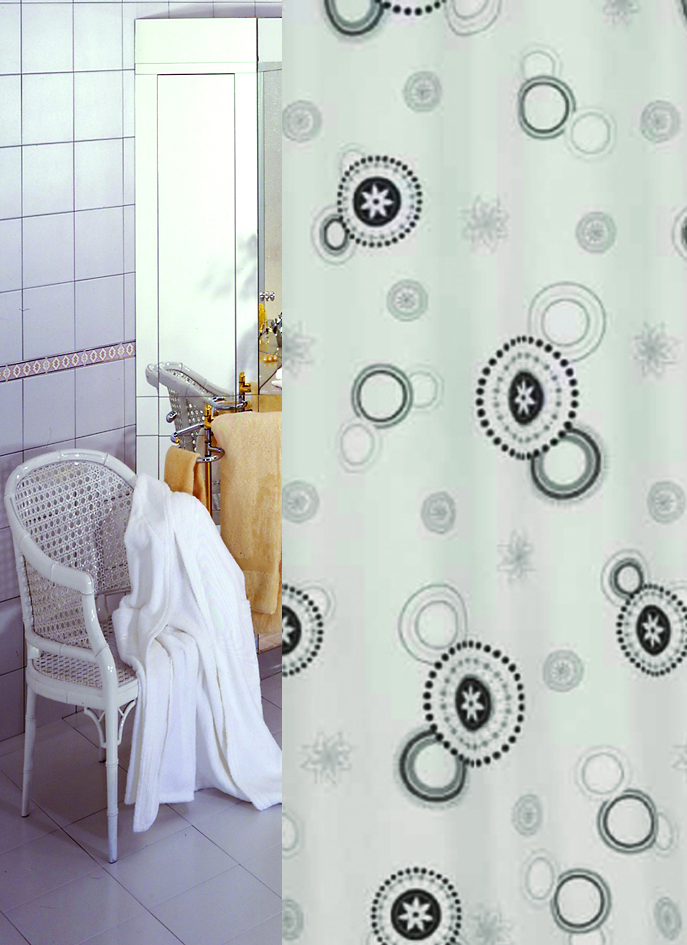 Polyester dodává látce jemnost na dotyk ale i pevnost v tahu. Zároveň si textilní koupelnové závěsy udržují voduodpudivé vlastnosti, nezachytávají nečistoty, čímž se snižují nároky na údržbu. Součástí balení jsou bílé plastové kroužky.